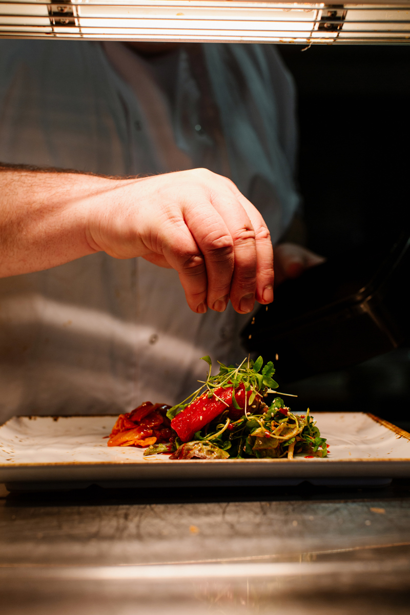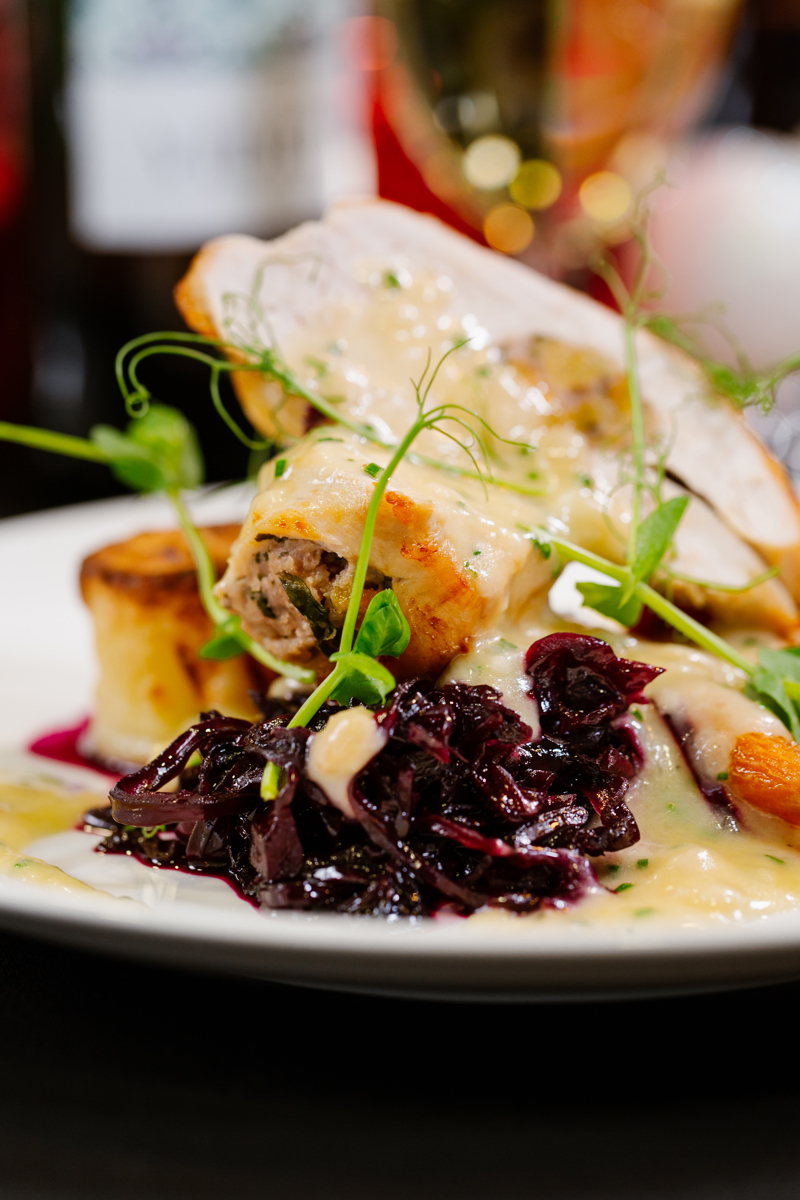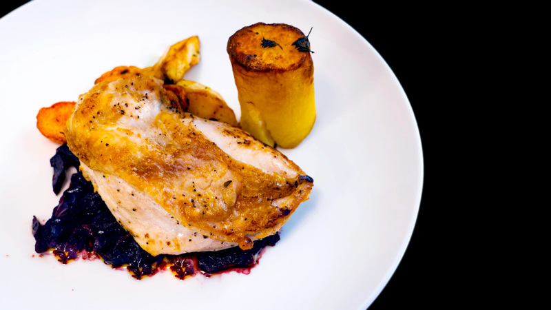 Garlic and thyme roasted chicken, served with shallot & chestnut sauce.