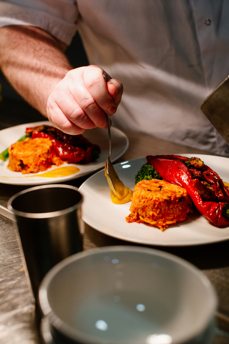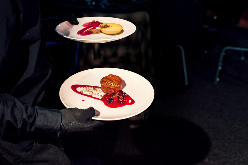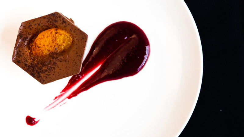 Rich chocolate and cherry vegan torte, served with a raspberry compote