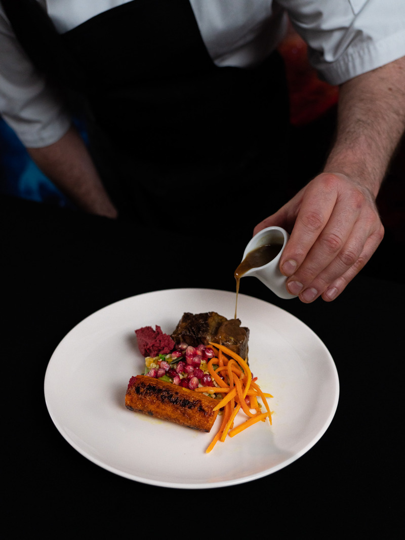 Celeriac, mushroom, thyme & cheddar filo parcel. Served with shallot and chestnut sauce.
