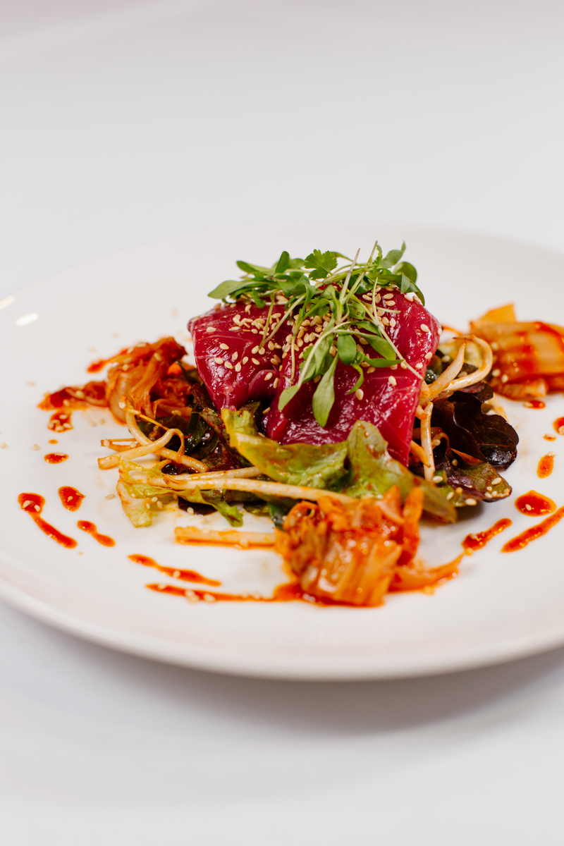 Poached scotch salmon with fresh prawns, accompanied by an apple & cucumber pickle. Served with yogurt and dill dressing.
