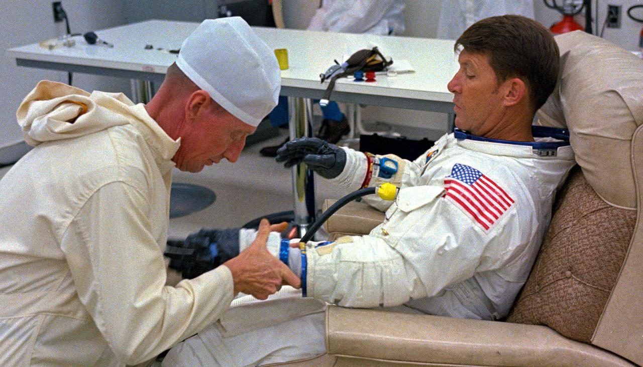 (5b) Jake Garn undergoing medical testing in space. Credit: NASA