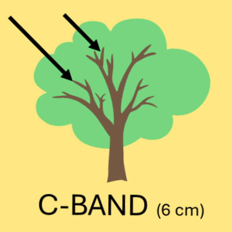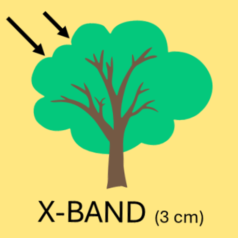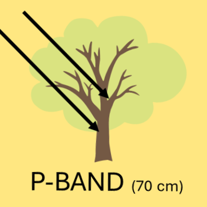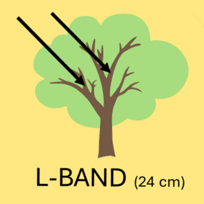 The images below show how different 'bands' of radar can be used to probe the different parts of trees, from focusing on the foliage and leaves, to specifically looking at the trunk and thick branches.