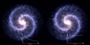 (2b – gif) Left: expected rotation curve of a galaxy. Right: A galaxy with a flat rotation curve and high velocity stars on the outer edges bound to the galaxy by the effects of dark matter. Credit: Ingo Berg CC BY-SA 3.0 DEED https://en.wikipedia.org/wiki/File:Galaxy_rotation_under_the_influence_of_dark_matter.ogv