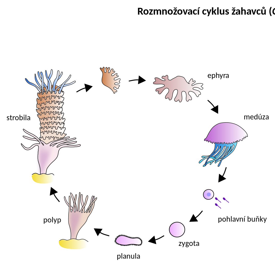 (2) From polyp to ephyra. Credit: Hana Janoušková CC BY-SA 4.0 (https://commons.wikimedia.org/wiki/File:Cnidaria-life-cycle.svg)