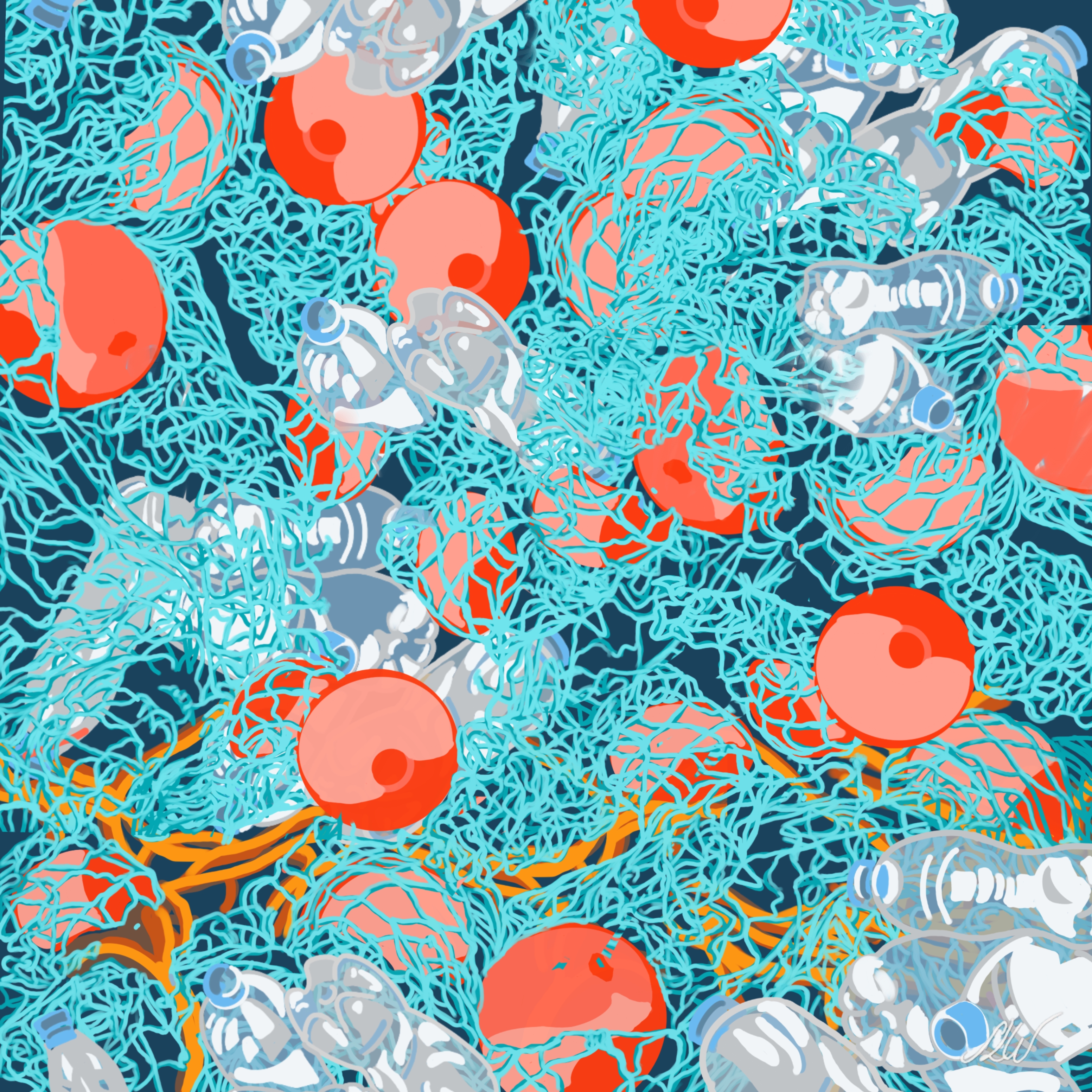 (4) Illustration Of Fishing Nets Tangled With Plastics And Bottles. Credit: © Scarlett Li-Williams (Sky Plum Studios)