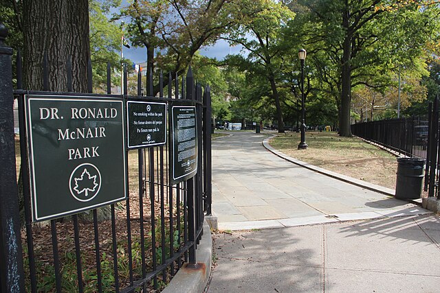 (5) Dr Ronald McNair Park in Brooklyn, New York – one of many public buildings and spaces dedicated to his memory. Credit: Thomson200 CC0 1.0 DEED - public domain (https://commons.wikimedia.org/wiki/Category:Dr._Ronald_McNair_Park#/media/File:Dr._Ronald_McNair_park,_Brooklyn,_Sept_2017.jpg)