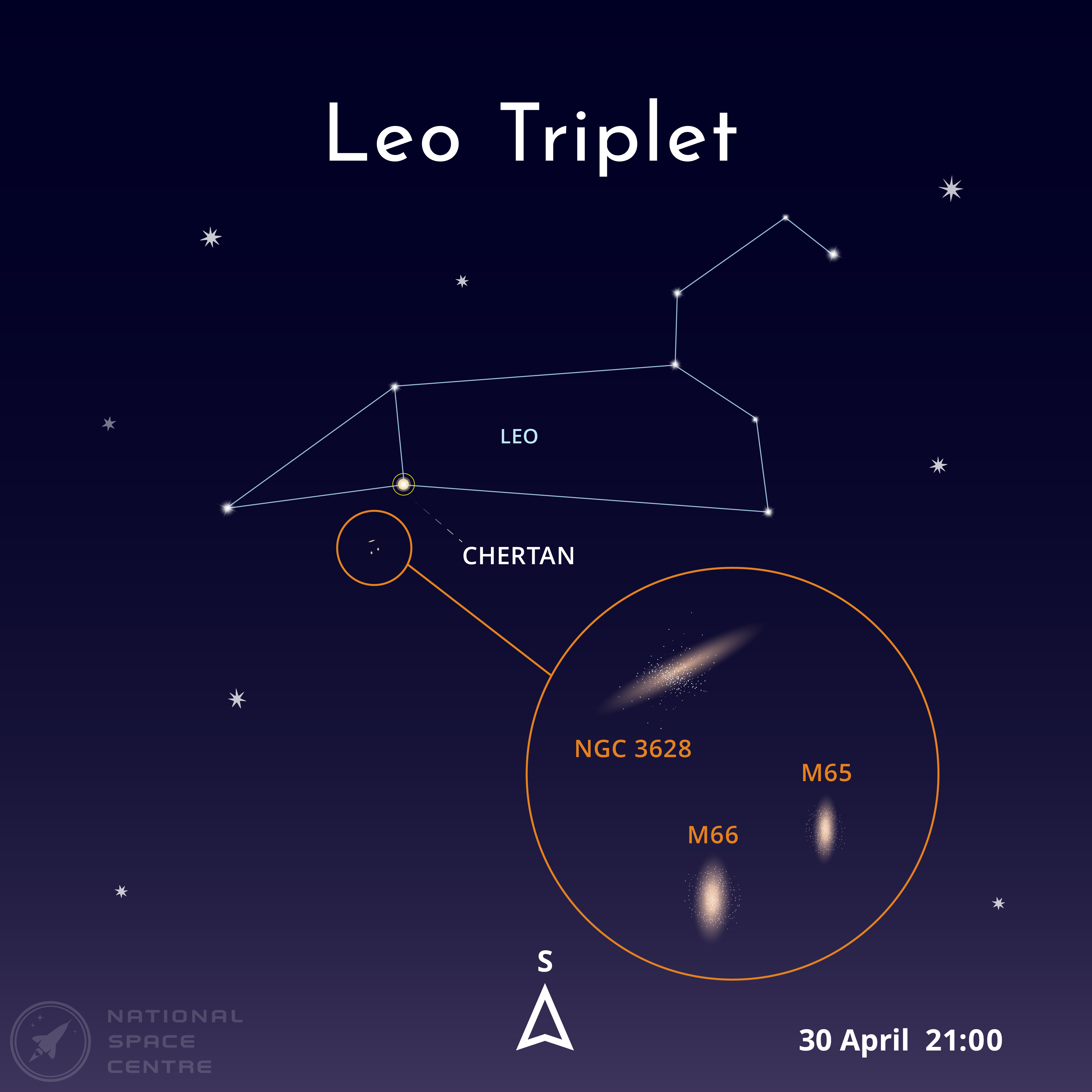 After becoming familiar with the constellation of Leo, look to the south at 21:00 at the end of April to find the constellation of Leo. Just below the star Chertan, lies a trio of galaxies forming a small triangle – NGC 3628, M65 and M66 - the Leo Triplet.