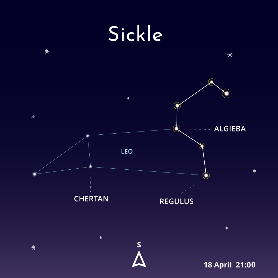 Face towards the south on the evening of 18 April to find a familiar star pattern known as the Sickle. Made up of six stars in a shape that looks like a reversed question mark ‘⸮’, this group of stars forms part of the constellation of Leo – making up the head and shoulders of the lion. It's a prominent spring constellation visible in the UK and although Leo can be seen throughout the month, it will sit firmly in the south at 21:00 during the middle of April.