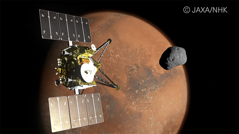 (2b) MMX will study Mars’ moons Phobos and Deimos. Credit: JAXA